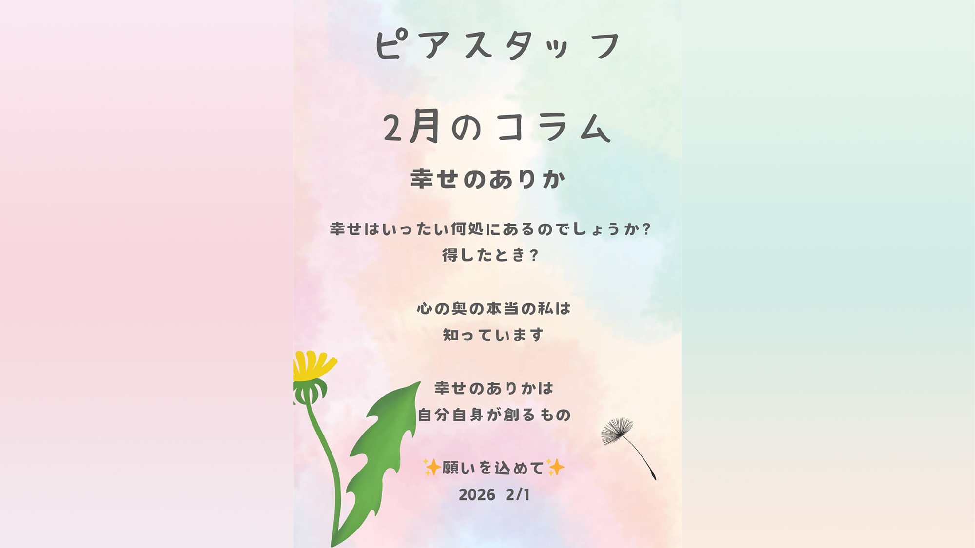 こんにちは! 2月のピアスタッフのコラムは 「幸せのありか」です。 幸せに生きる事は、永遠のテーマですね。私自身、得した時(ラッキーな時)は確かに嬉しいものですが、それが幸せかというと違う気がします。 幸せな時間を作り […]お知らせ