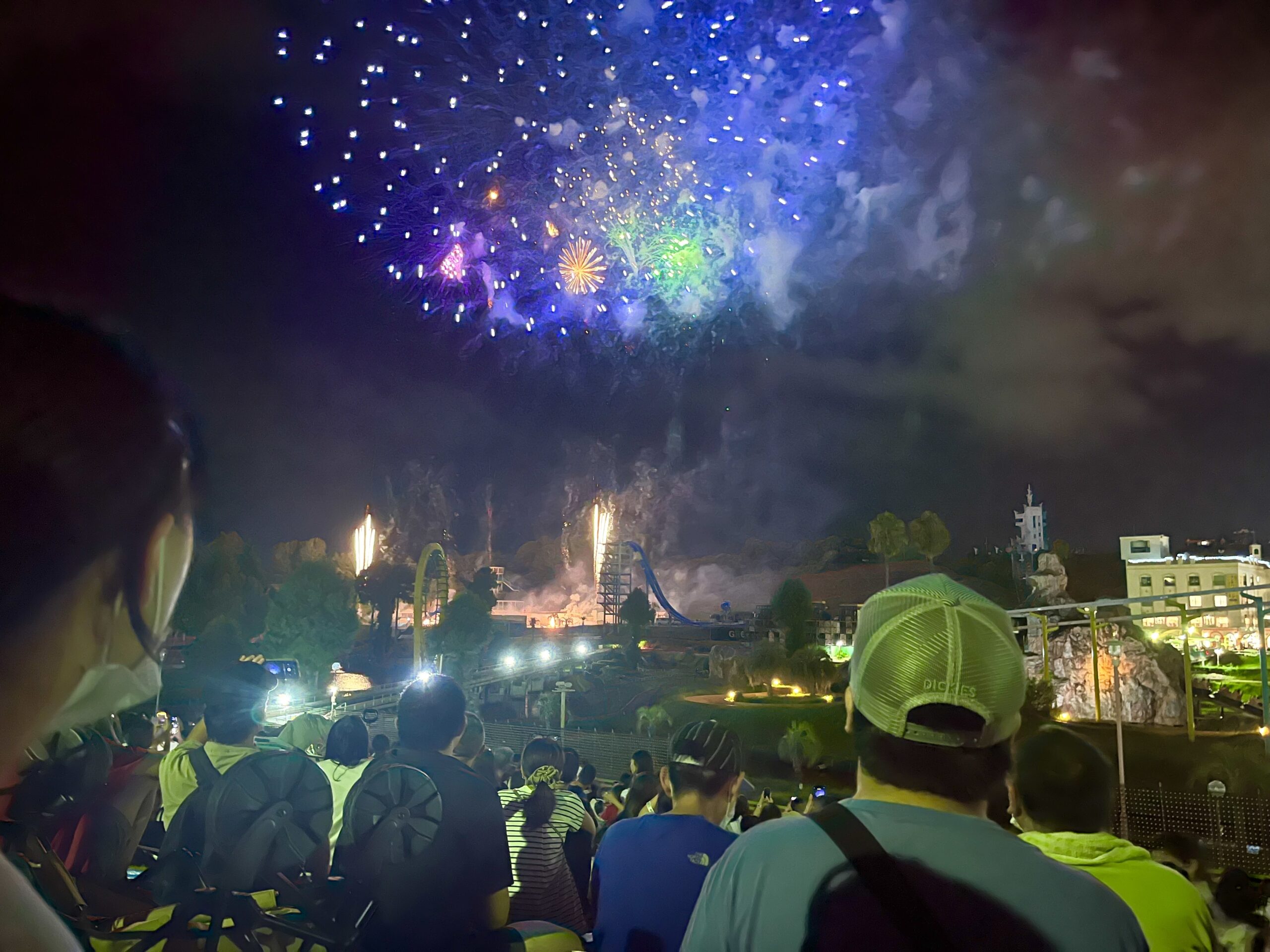 少し早めに園内に入り、飲み物やお土産を買ったり、散策したり。辺りが暗くなると、いよいよ待ちに待った花火の打ち上げが始まりました。