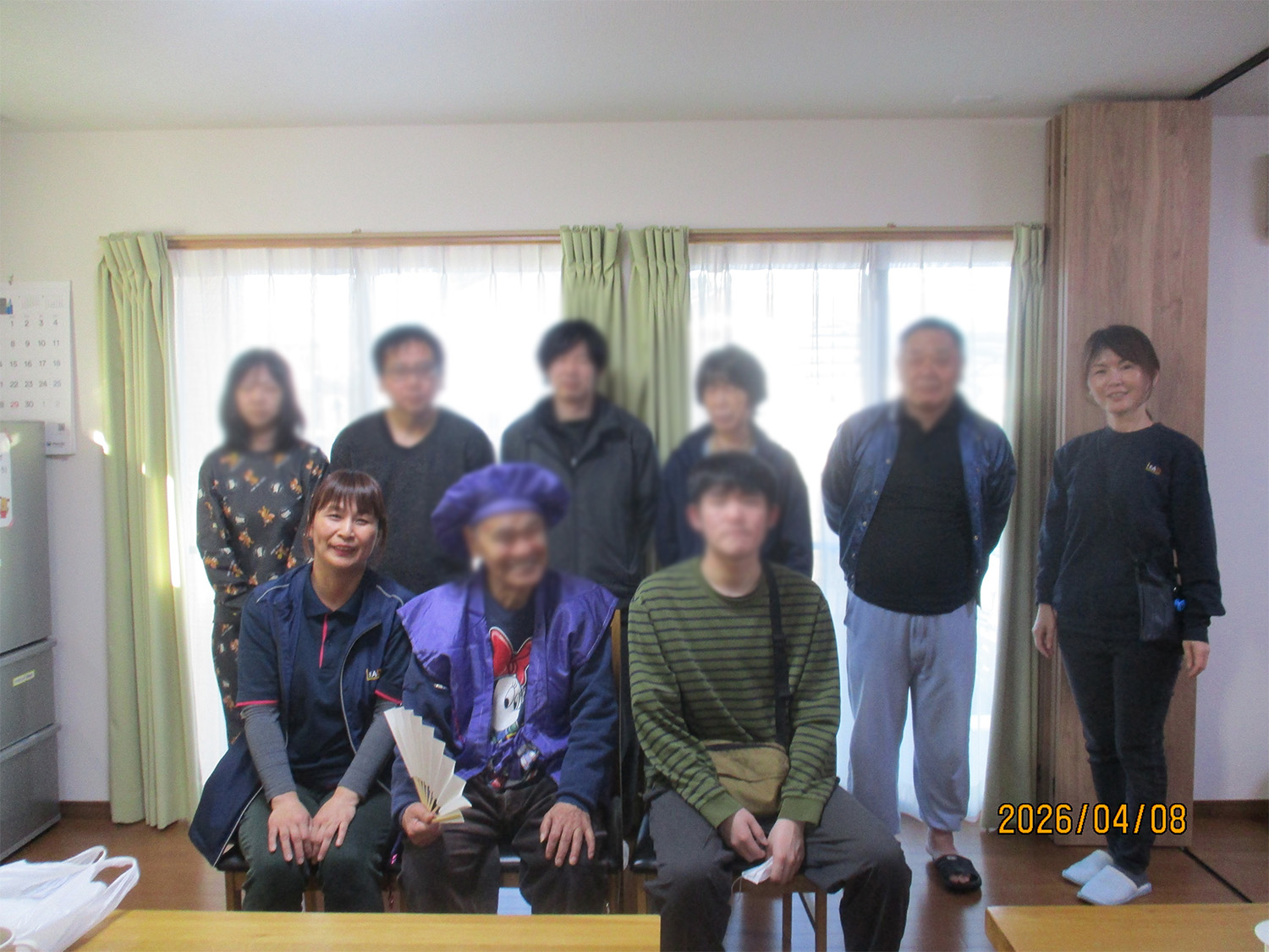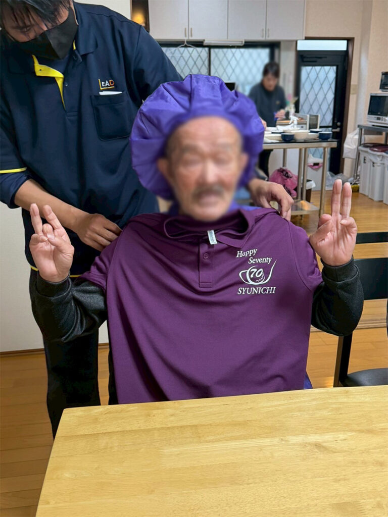 お二人にはグループホームから古希にちなんだ紫の記念品をプレゼントし、紫のちゃんちゃんこ等での記念撮影も行いました。